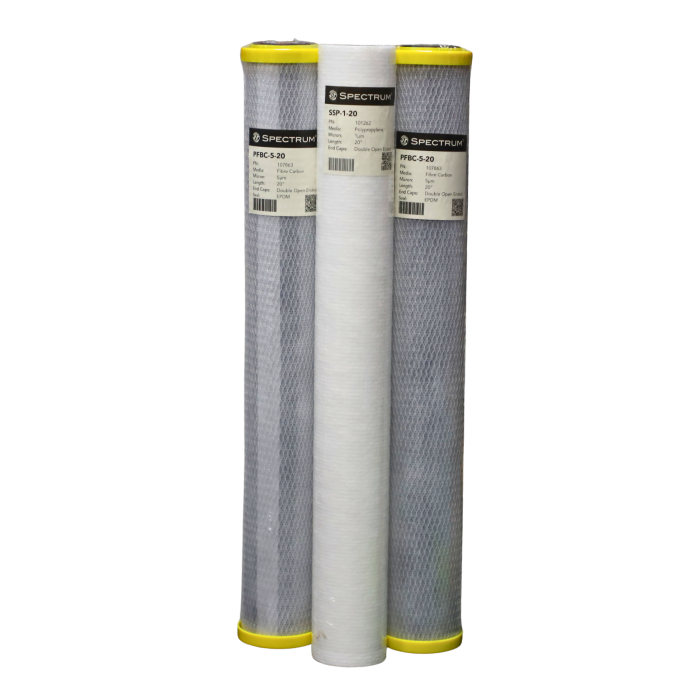 Consists of Spectrum 1 micron 20" Sediment filter and 2 Spectrum 20" PFBC carbon filters.